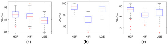 Figure 7 shows the box plots of OAs by different methods. The box plot is a simple summary for the data distribution. In this paper, we have conducted all the methods 50 times, and the results in each running are displayed by box plots. In a box plot, the red line in the box denotes the median. The top and bottom of a box are the 75th and 25th percentiles, respectively. Data outside the box are mild and extreme outliers. Because LGE, HiFi and present the closest accuracies in the three data sets, we only show the box plots by these methods in Figure 7, and take OA for example. We can see that the boxes of are higher than the others in all the three data sets, and the advantage is more apparent in GRSS_DFC_2014. Moreover, we use a paired t-test to further validate that the improvements by are statistically significant, which is defined as follows: