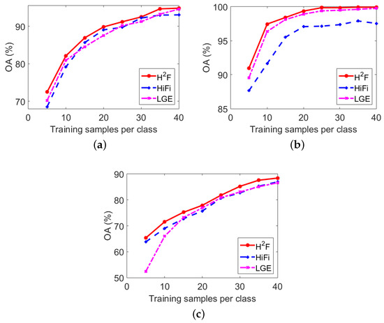Finally, we give an evaluation for the influence of training samples number in Figure 9. Classes with totally 20 around samples are ignored because they have little influence on OA. Similar to Figure 7, HiFi and LGE are used for comparison. As is expected, the accuracy improves with the increase of training samples number. outperforms the others in most cases. In particular, we note that the gaps are more apparent when training samples are limited. This results may indicate that could provide more representative feature expression for the original HSI data.