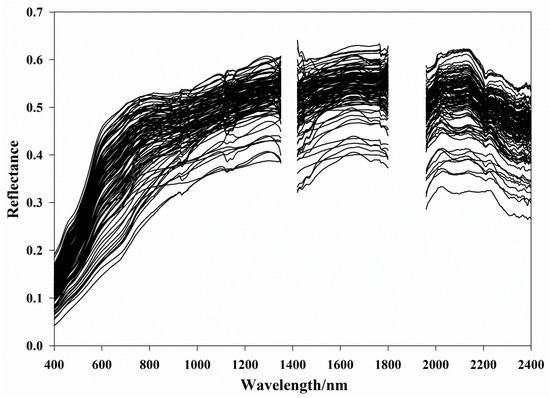 Figure 1 shows the field spectral reflectance of 108 soil samples. The spectra show large variations between different samples that are caused by soil color, soil composition, water content, particle size, and the coverings on the soil surface, such as residual dry vegetation, rock particles, and mineral deposits [61]. The obvious spectral signatures near 930 nm may be related to the absorption of hydroxyl in Fe oxides [25], the ones near 940 nm, 1150 nm and 1450 nm may be influenced by the absorption of the atmospheric water content [62]; the ones near 1765 nm may be related to the signal jump of the spectral instrument; the ones near 2205 nm may be related to the absorption of Al-OH [25]. The spectral signatures ranging from 2300–2400 nm may be related to several other clay minerals and soil organics [63].