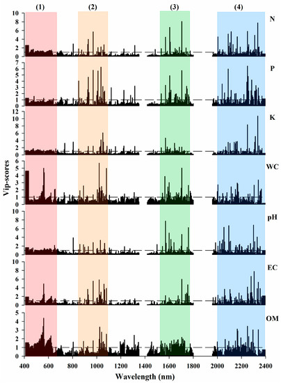 Besides the four feature-block regions, several important individual wavebands with significantly high VIP scores still could be seen in Figure 2. The 730 nm waveband in the prediction of K, WC and EC may be related to the sensitive absorption of soil salinity [67]. The 805 nm waveband is related to the red-edge, which is known to be sensitive to biomass [69], and the predictions of P, K, pH and OM were found to be correlated. The 1120 and 1155 nm wavebands may be related to the v S–O stretching bands of sulfate [70], which can be used to predict P and K. The 1225 nm [71] and 1315 nm [72] wavebands were found to be important bands for predicting soil organics; here, several properties are correlated. The 1450 nm waveband in the prediction of OM may be related to the carboxylic acids in organics [25].