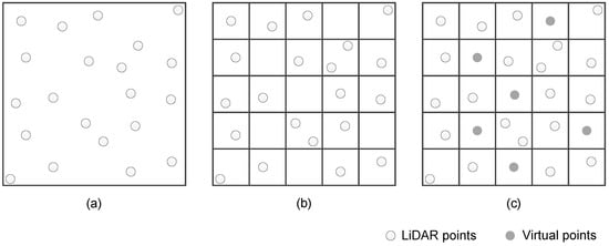 Organizing point clouds with a grid index: (a) input point clouds; (b) constructing a grid index on point clouds; and (c) filling empty grid cells with virtual points.