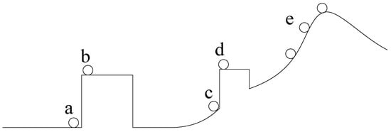 However, drastic terrain changes, such as point e, exhibit large gradients. To differentiate low transition points such as points a and c from steep slope points such as point e, the gradient of external gradients, which is denoted by ∆(ρ+B), can be defined as follows: