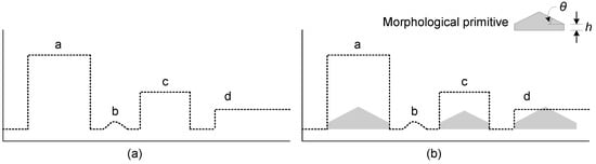 The dilated points are shown in Figure 4d. Non-ground points are determined based on the difference of elevations before and after the geodesic transformations. The points are classified as objects if the elevation difference is larger than the threshold that is set to the height h of the proposed morphological primitives.