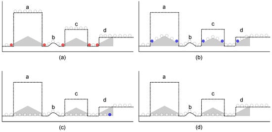 Example of the morphological filter by combining geodesic transformations: (a) original point set (the red points are the low transition points); (b) the process of reconstruction by erosion (the blue points represent the marker set for morphological reconstruction operator by erosion); (c) the results of reconstruction by erosion (the blue points represent the marker set for morphological reconstruction operator by dilation); and (d) the results of reconstruction by dilation.