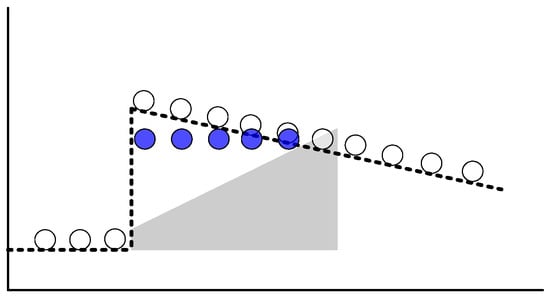 Subsequently, geodesic dilation is performed. If the terrain exhibits significant changes as shown in Figure 5, the terrain points, such as the blue points, are not retrieved to the original surface. Thus, if the eroded surface has gradual changes regarding the surrounding intact points, the points on the gradual surface are assigned to the original surface after the geodesic dilation. For a point pi ∈ f, its elevation Zδi after dilation is defined as follows.