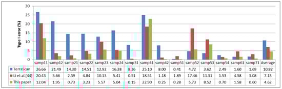 Comparison of type I errors for filtering the International Society for Photogrammetry and Remote Sensing (ISPRS) datasets.