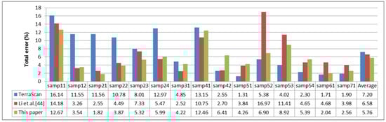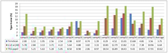 The comparison shows that the proposed method tends to suppress omission error, and obtain a relatively lower average total error. However, the commission error is high compared to the other methods. Thus, our method classifies more non-ground as ground points than the other two methods, while fewer ground points are removed from the dataset as they are classified as non-ground points. In the present case, our filtering method is biased in favor of minimizing Type I errors as shown in Figure 10.