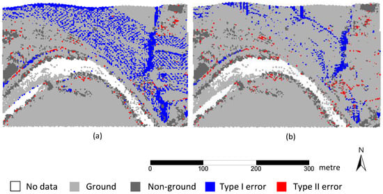 The quantitative evaluation of filtering algorithms is commonly based on three types of errors: omission, commission and total errors []. Omission error, which is also called type I error, is the percentage of ground portions removed as objects. Commission error, which is also called type II error, is the percentage of object portions misclassified as ground. Total error is the overall percentage of all misclassified points in point clouds. A cross-matrix of filtering result can be obtained (Table 2), and then the three types of errors are calculated as Formulas (19)–(21).