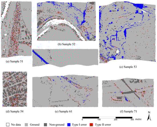 The error distributions of different algorithms are presented in Figure 11 and Figure 12, which show that this new filtering method achieves promising and comparable results for diverse landscapes. The proposed filter can effectively remove diverse buildings of different sizes and complex shapes, as shown in samples 12, 22, 23, 31, and 41, because the morphological primitive based on geodesic transformations is self-adaptive for various objects. The configuration with various vegetation and buildings on steep hillsides is effectively filtered, as shown in samples 11, 24, and 52. Small objects such as cars and shrubs are mostly eliminated as shown in sample 12. Various terrain features, especially drastic elevation changes and discontinuity, are well maintained when filtering uneven areas as shown in samples 11, 22, 23, 51, 52, and 53. Bridges and building and vegetation on steep slopes are successfully differentiated as shown in samples 11, 21, 22, and 71 because filtering with directional structuring elements is conducted specially for removing the attached objects. The filtering performance is not influenced by the data gaps that are commonly the consequences of water absorption or scan swath as shown in samples 41, 51, 52, and 61. Elongated and low objects with sparse ground points among them cause the large commission errors (see sample 42) due to the filter hypothesis that objects have distinct low ground points around them. Several buildings and vegetation of low resolution are not successfully removed (see samples 51 and 54) because the low density of point clouds reduces the elevation changes of low objects compared with the ground surface.