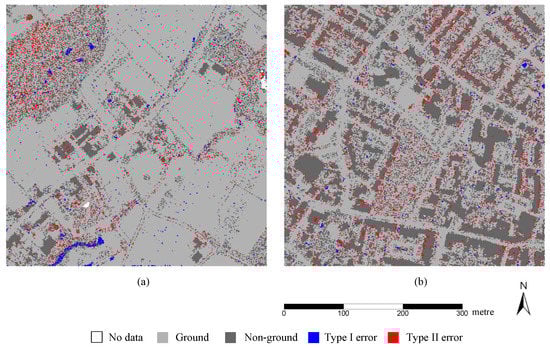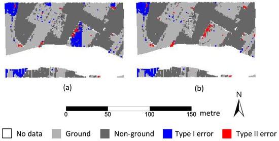 Error distribution of the proposed method filtering AHN data: (a) result of AHN Test Site 1; and (b) result of AHN Test Site 2.