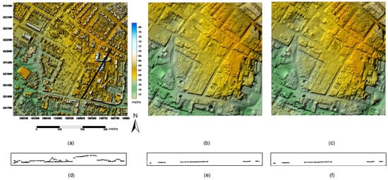 Results of the proposed method filtering AHN Test Site 2: (a) DSM generated from raw point clouds (the dark line denotes profile position); (b) DEM generated from true ground points; (c) DEM generated from ground points derived by the proposed filter; (d) LiDAR points along the profile in (a); (e) LiDAR points along the profile in (b); and (f) LiDAR points along the profile in (c).