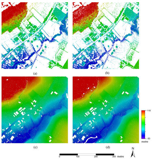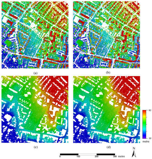 Results of the proposed method filtering AHN Test Site 2: (a) true non-ground points; (b) non-ground points derived by this filter; (c) true ground points; and (d) ground points derived by this filter.