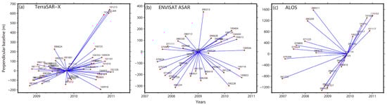 Two external DEMs covering Shenzhen city, the SRTM-1arc with a resolution of 30 m in 2000 and the TerraSAR-X/TanDEM-X DEM with a resolution of 5 m in 2014 generated by an iterative DInSAR fusion technique [,], were collected, as shown in Figure 1a,b. It should be noted that the accuracy of the fusion DEM is also affected by the surface features, as described in [], even though the fusion method can reduce the effects of geometric distortions. Obvious height differences in Figure 1c caused by the resolution and precision difference and the city development in the period of 2000 and 2014 are observed. In addition to the DEM data, three platforms were selected to analyze the influences of external DEM quality on StaMPS-PS: 44 X band TerraSAR-X images (October 2008 to December 2010), 34 C band ENVISAT ASAR images (June 2007 to September 2010) and 23 L band ALOS/PALSAR-1 images (December 2006 to January 2011) (Tables S1–S3). The data coverage and spatial and temporal baseline distribution maps are shown in Figure 1a and Figure 2.
