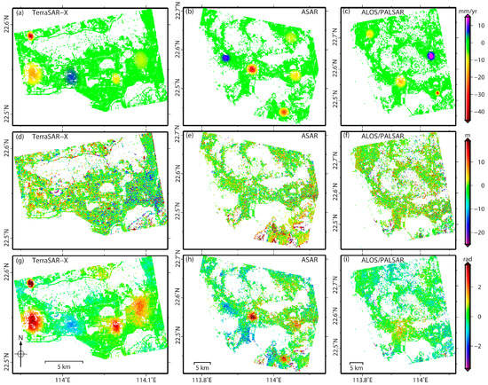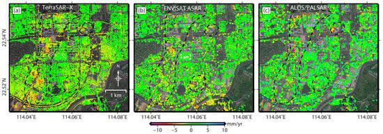Comparison of mean deformation rates of Luohu district for: X band (a); C band (b); and L band (c).