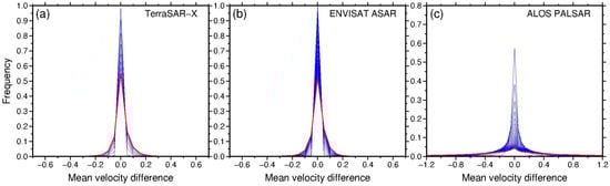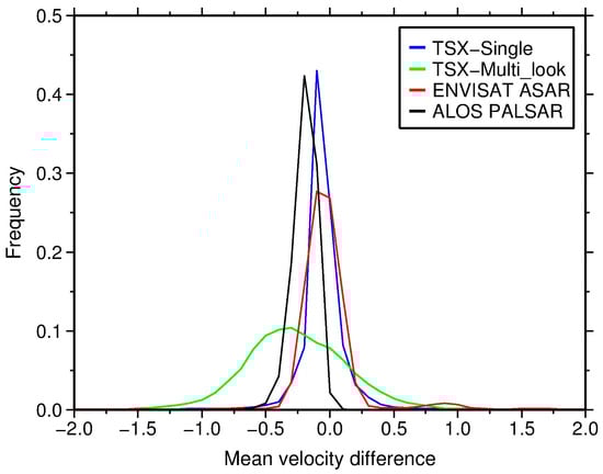 Histograms of the mean deformation rate difference caused by external DEM difference and geocoding multi-look operations for three platforms. The blue line represents the histogram of mean deformation rate difference between single-look geocoding with TanDEM-X DEM and single-look geocoding with SRTM-1arc DEM. The green line is the result between single-look geocoding with TanDEM-X DEM and multi-look geocoding with SRTM-1arc DEM. Red and black solid lines represent the results of ENVISAT ASAR and ALOS/PALSAR images with single-look geocoding operation, respectively.