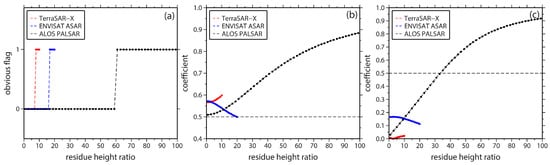 (a) The significance test of deformation rate difference between h_ratio > 1 and h_ratio = 1 for three different platforms. Value 1 means the significance test is passed while value 0 means the opposite. (b) The relationship between mean deformation rate accuracy and topographic residuals precision for every h_ratio value. The y-axis is the correlation of two factors for every h_ratio. (c) The relationship between time-series deformation RMSE and topographic residuals precision for every h_ratio value. The y-axis is the correlation of two factors for evey h_ratio. The red, blue and black dashed lines represent the results of TerraSAR-X, ENVISAT ASAR and ALOS/PALSAR, respectively.
