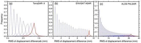 Histograms of deformation time-series RMSE between h_ratio > 1 and h_ratio = 1 for: X band (a); C band (b); and L band (c). Blue solid lines represent the deformation time-series RMSE of each case. Red solid lines represent the time-series deformation RMSE histogram when the significance test of deformation rate difference is firstly passed for each platform.