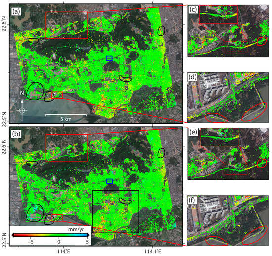 Mean deformation rate maps for X band with different external DEMs: SRTM-1arc DEM (a); and TanDEM-X DEM (b). (c–f) The zoom of the areas outlined by red rectangles in (a,b). Areas outlined by black solid lines have obvious deformation rate differences in (a,b). The black rectangle in (b) is the overlap areas selected for deformation rate comparison of the three platforms. The blue bold rectangles are the reference areas.