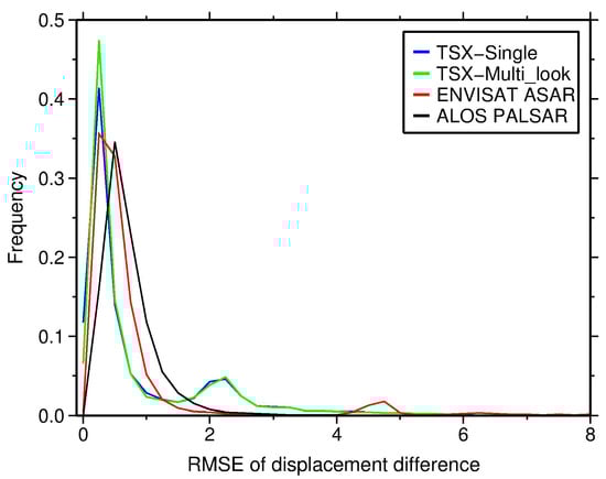 Histograms of deformation time-series RMSE difference caused by external DEM difference and geocoding multi-look operations for the three platforms. The blue line represents the histogram of deformation time-series RMSE difference between single-look geocoding with TanDEM-X DEM and single-look geocoding with SRTM-1arc DEM. The green line represents the result between single-look geocoding with TanDEM-X DEM and multi-look geocoding with SRTM-1arc DEM. Red and black lines represent the results of ENVISAT ASAR and ALOS/PALSAR images with single-look geocoding operation respectively.