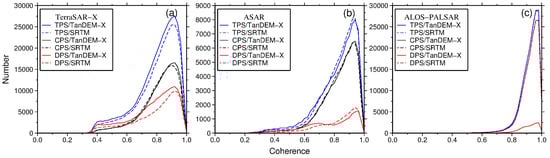 To analyze the influences of external DEMs on the coherence calculation, we calculated the coherence of the TPS for each platform, and extracted coherence of CPS and DPS at the same time. The results are shown in Figure 13. The coherence of TPS of X band is improved obviously when the external DEM is TanDEM-X DEM, as shown by the blue solid line in Figure 13a. The coherence of CPS is improved when it is higher than 0.86 (), otherwise, it remains the same. For the DPS, the TanDEM-X DEM can improve the coherence greatly, as shown in Figure 13a. The improvement for C band is different from that of X band, in which the improvement is only obvious when coherence is smaller than 0.72 () (Figure 13b). The coherence of CPS is increased a little when it is larger than 0.92 (). For coherence of DPS for C band, the TanDEM-X DEM has an obvious improvement at . The results of C band indicate that high resolution external DEM can improve coherence of area whose coherence is smaller than 0.72 to increase the PS number. In contrast with X and C band, the coherence of L band remains stable for the three kinds of PSs, as shown in Figure 13c.