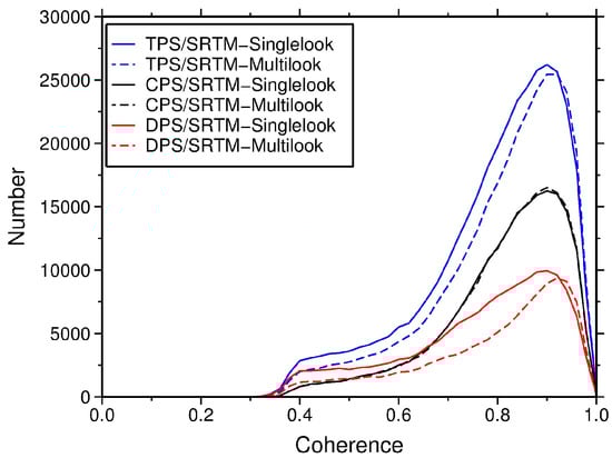 Coherence comparison between single-look geocoding and multi-look geocoding operation for TerraSAR-X with the external DEM SRTM-1arc. Blue, black and red solid lines represent the coherence histograms of TPS, CPS and DPS for single-look geocoding. Blue, black and red dashed lines represent the coherence histograms of TPS, CPS and DPS for multi-look geocoding.