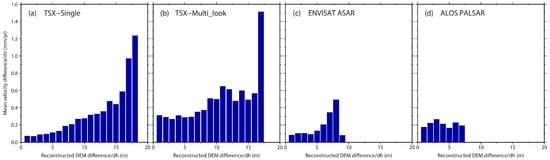 We analyzed the relationship between the reconstructed absolute DEM difference (dh) and the absolute mean deformation rate difference (dv). We firstly refined the absolute difference with a threshold of mean deformation rate precision, which is obtained together with the mean deformation rate in StaMPS-PS, because of different detectability of platforms [,]. Hence, 0.8, 0.9 and 1.4 mm/year were selected empirically for X, C and L bands, respectively. Secondly, the absolute DEM differences are divided from 0 to 20 m into 20 groups of each band uniformly. Thirdly, we calculated the average absolute velocity difference in each group. Finally, we plotted the histograms of three bands, as shown in Figure 16. We can see that the average absolute velocity difference is increasing with the increase of the absolute DEM difference interval for the X band (Figure 16a,b) and C band (Figure 16c), indicating that the incorrect estimation of residual topography can cause differences in deformation rate calculations. However, for the L band, the proportional relationship is not obvious (see Figure 16d). This may be caused by the large ambiguity height of L band.