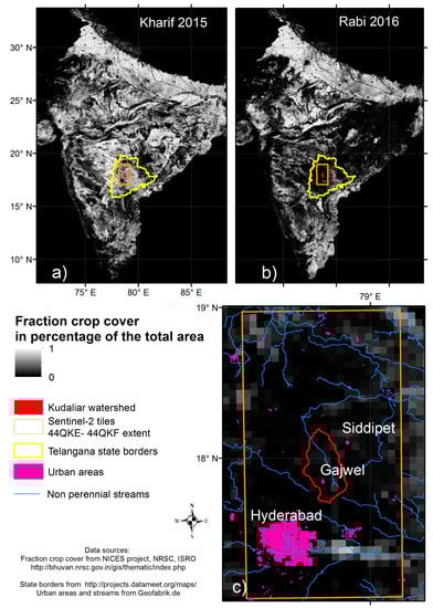 Location of the study area in Telangana State, South India. The Kudaliar watershed area is embedded in two Sentinel-2 tiles (orange outline). (a) Fraction crop cover in wet Kharif season 2015 (July to November); (b) fraction crop cover in dry Rabi season 2016 (December 2015 to March 2016); (c) fraction crop cover for the study area in Rabi 2016. This product is provided at 5 km resolution from optical remote sensing at 56 m resolution