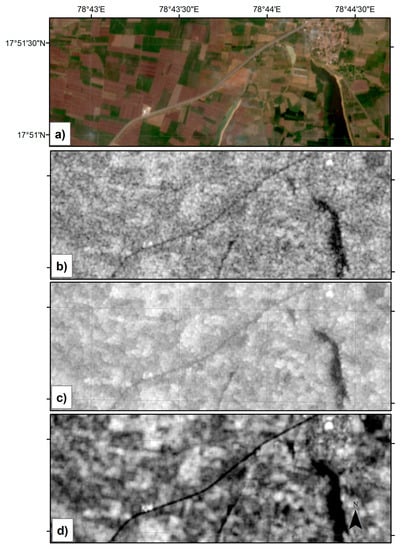 Extreme dry hydrological conditions were found during the Rabi 2016: aquifer water levels were low (around 30 m depth) since the previous monsoon rainfalls were limited (600 and 700 mm for 2014 and 2015, respectively). No surface water was visible (Figure 3) and the inundated rice extent were estimated to be around 2–3% of the total area from a preliminary land cover classification work []. The 2016 monsoon was late so July and August were still dry, but there was extremely heavy rainfall in September 2016. Hyderabad received 425.2 mm of rain compared with its monthly mean of 132.9 mm, surpassing the decade’s highest rainfall of 266.6 mm, which occurred in September 2007.