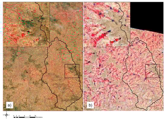 Sentinel-2 false color (infrared, red, and green color composite) (a) on 10 March 2016 (Rabi 2016) and (b) on 5 March 2017 (Rabi 2017). Red colors correspond to well-developed inundated rice, irrigated maize and vegetables. The black line represents the limits of the Kudaliar watershed. An enlarged view of the area located in the black square is shown at upper left. In Rabi 2017, small surface water areas (black) are visible, due to the water harvesting system’s refill during the exceptional high rainfall events of the previous 2016 monsoon (mainly September rainfall).