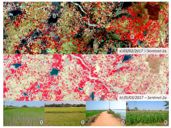 Sentinel acquisition time series enable the identification of surface changes that occur over several months. Figure 5 shows an example of Sentinel-2 acquisitions at 10 m resolution (infra-red, red, green) over a cropland area in the study site with a one-month shift. In February 2017 (Figure 5a), red pixels are irrigated maize or to a lesser extent vegetables; the brown to grey areas are flooded rice paddies at an early stage. These areas become red one month later with the growth of rice biomass (Figure 5b). Black areas correspond to the water filling “tanks.” These areas are decreasing slowly with water use for irrigation, direct evaporation from the water surface and the ground infiltration that recharges the aquifer.