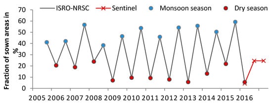 In India, high-resolution satellite missions (56 m spatial resolution) have been used to measure seasonal land cover. In 2016, the National Information System for Climate and Environment Studies (NICES) project released a national database of seasonal net sown areas (http://bhuvan.nrsc.gov.in/data/download/index.php), which highlights the high spatiotemporal heterogeneity of land cover and its temporal dynamics. This dataset is published as a fraction of the crop sown at 5 km resolution by the National Remote Sensing Center (NRSC) laboratory, part of the Indian Space Research Organization (ISRO). A similar program, called Water Bodies Fraction (WBF) and based on the same data type, produces the areal fraction of surface water every 15 days since 2012. The short-term variations of sown areas show a high temporal variation over recent decades in the Hyderabad region, with 41 to 58% of sown areas in Kharif and 8 to 22% in Rabi between 2005 and 2016. The seasonal restitution of the areas of inundated rice and other irrigated crops from multi-temporal high resolution satellite remote sensing is thus a promising method for estimating the surface water and groundwater requirements for irrigation.