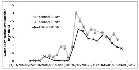 The 18 Sentinel-1 images acquired between the end of June 2016 and February 2017 were used to classify surface water areas, using two classes: water and non-water. Figure 8 shows the surface water temporal dynamic detected from S1 backscatter using the RF algorithm over the Kudaliar watershed. This automatic classification strategy is preferred to the threshold method used in Figure 4 by the Google Earth Engine platform, which requires selection of an appropriate threshold for each image. Very good F-scores (>0.98 for each image) were obtained from this classification using the permanent surface water training dataset. Both resolutions of Sentinel-1 (10 and 20 m) are considered in this work and give similar results. More than 200 small reservoirs were detected and monitored over the 1000 km2. This detection shows fast dynamics of surface water areas impacted by rainfall and runoff collected within the reservoir, evaporation from surface water, soil infiltration and pumping for irrigation. The Water Body Fractions extracted from the Indian national database were compared with the surface water areas found with Sentinel-1. Each fraction is provided for 15 days from ResourceSat optical remote sensing at 56-m resolution (Figure 8, bold black line). The lower resolution of the Indian optical satellite (56 m versus 10–20 m) underestimates the water bodies’ areal extents: boundary pixels not fully covered by water are not classified as water, leading to an erosion of the detected water surface areas.