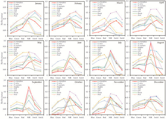 - Gao, Z.G.; Zhang, L.Q. Multi-seasonal spectral characteristics analysis of coastal salt marsh vegetation in Shanghai, China. Estuar. Coast. Shelf Sci. 2006, 69, 217–224. [Google Scholar] [CrossRef]