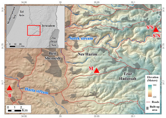 General map of the research sites. The grey lines represent elevation contours at vertical intervals of 100 m. The source of all elevation and vector data is the Survey of Israel database. Sites: B—Britanya park; M—Mata; S′S—Sataf, southern facing slope; S′N—Sataf, northern facing slope.