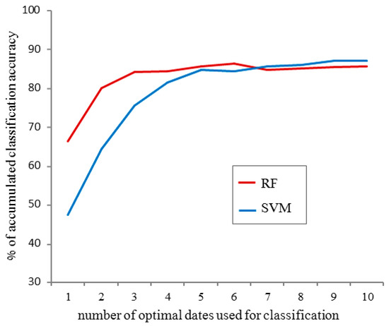 - Comparison of the accumulated classification accuracy for the first ten optimal dates, using separate runs for testing the use of the RF and SVM classifier. We found that RF led to better classification accuracy compared to SVM, and therefore the following scenarios were all run using RF only (see Results). This was done using all spectral indices for observations in the S’S site only.