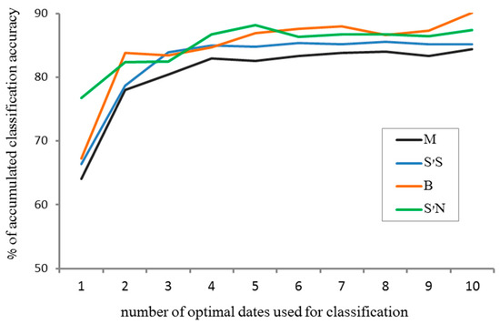 - Examining the accumulated classification accuracy for the first ten optimal dates, comparing between using different combinations of the spectral indices (see Results), in order to examine their contribution to classification accuracy. This was done by using RF, for observations in the S’S site only.
