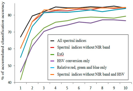 The NIR band did not have a substantial contribution to the total classification accuracy of the near-surface time series. After the first two optimal dates, the total accuracy with no NIR-based spectral indices was close to the output accuracy of all spectral indices (81% and 82%, respectively; Figure 8, scenario 1 and 2). The negligible contribution of the NIR band could be related to the relatively low signal to noise ratio of the external filter method [70]. In fact, by using only the chromatic coordinates of the three visible bands (relative blue, green and red; scenario 5), the output classification accuracy after the first two optimal dates also reached 81%. The addition of HSV conversion, NDVI, gNDVI, ExG, GRVI, EmE (see Table 2) and total brightness resulted in higher accuracy for the first two optimal dates, as well as a small improvement from the third optimal date and onwards (scenarios 1, 2 and 6; Figure 8). Using only HSV conversion, or ExG alone, resulted in lower classification accuracy (70% and 72% for the third optimal date, respectively; scenarios 3 and 4; Figure 8).