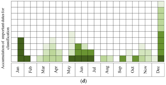 The scattering of the optimal dates for classification of the near-surface time series throughout the year differed between the four sites, and in all cases was not distributed evenly over time (Figure 9a–d). However, the first optimal period for classification occurred during the late fall (November–December; S′S, S′N) or early winter (December–January; M), with the exception of site B (divided between winter, December–February, and summer, May–July). Nevertheless, despite the lack of consistency among sequential runs in the same site, the classification accuracy remained stable; the average standard deviation of overall accuracy in the four sites after the five optimal dates was 0.83%.