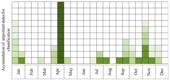 P. halepensis and Q. calliprinos are both evergreen, and they do not demonstrate prominent visual differences throughout the year. However, Figure 10 demonstrates the convergence of all cross-validation runs, pointing at the second half of April (end of spring) as the most important period for separation between the two species. This consistently selected period matches the flowering and leaves growth of Q. calliprinos [61,108]. Apparently the spectral expression of this phenophase results in improved ability of discrimination from P. halepensis, since after the five most important dates for classification the average overall accuracy of the 10 sequential runs was 98%.