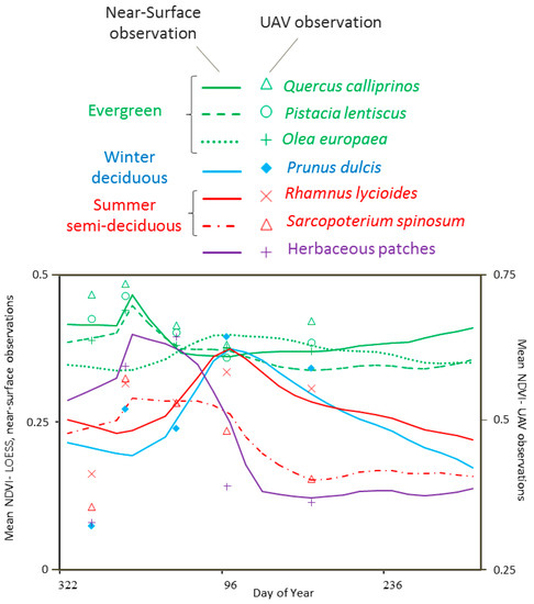 The overhead time series imagery demonstrates visually the discrimination between the main phenological groups (Figure 11). Rocks, trails and ruins appear in black because of low and fixed NDVI values. Herbaceous patches and partial summer deciduous shrubs appear in shades of green because of the prominent NDVI peak during spring. Winter deciduous trees appear in shades of blue because the foliage cover is developed during late spring, and the NDVI values are relatively high and stable during early summer. Evergreen trees and shrubs appear in bright colors due to high NDVI values all year round. The UAV derived NDVI values of the evergreen species and the herbaceous patches both presented a similar annual pattern to those acquired by the preliminary near-surface observations, despite the different range of values resulting from the significant differences between the sensors (Figure 12). The NDVI values of the deciduous species in the first UAV image (20 December 2016) were lower than those of the parallel near-surface values, possibly due to the exceptional absence of autumn precipitation during the fall of 2016 (Figure 13).