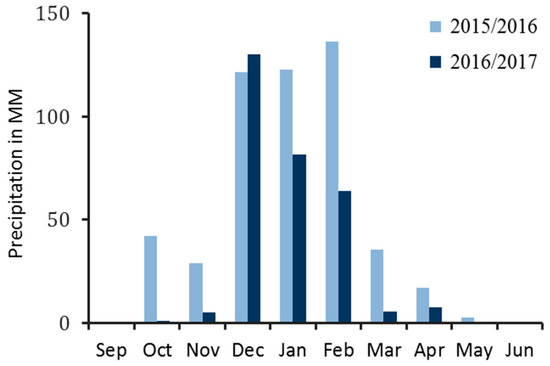 Intra-annual differences in precipitation between the near-surface observation period (2015/2016) and the UAV observation period (2016/2017). The precipitation amount was measured at the Tzur Hadassah station of the Israel meteorological service, about 4.5 km east of the Mata (M) site (Figure 1).