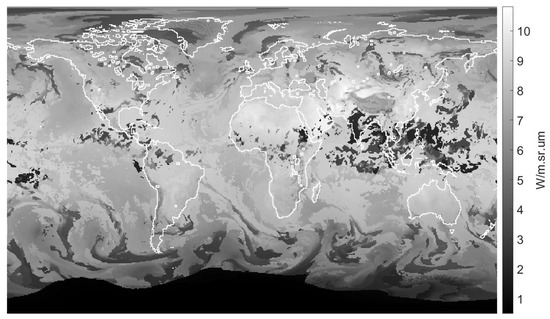 All models were evaluated using the Moderate-Resolution Imaging Spectroradiometer (MODIS) [20] on-board the Terra satellite, v6. MODIS repeatedly views regions of the Earth’s surface every 1 to 2 days. Its thermal bands have a spatial resolution of 1 km at nadir. Twelve Terra/MODIS thermal infrared radiance scenes were used for reference data. Terra/MODIS thermal data band 31 (with range from 10.78 to 11.28 m) was used as a reference since it is well calibrated [21] with a calibration uncertainly of less than 0.13%.