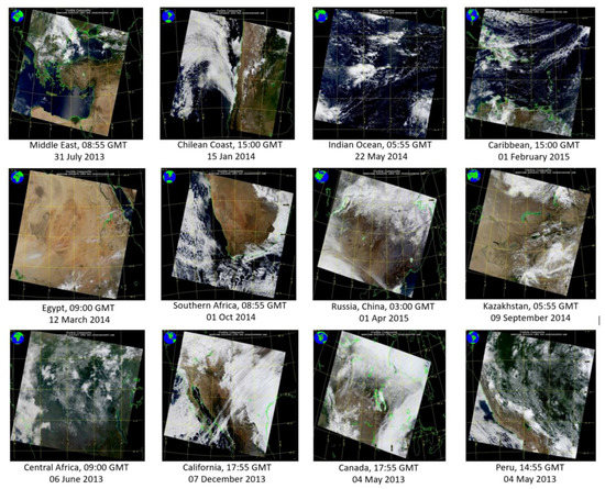 Twelve Terra/MODIS band 31 test scenes were chosen to coincide temporally with the three-hourly air temperature and relative humidity fields in MERRA-2, and for their diverse cloud and land cover. Each scene was bi-linearly down-sampled to the same spatial resolution as MERRA-2 data (0.5 × 0.625 degrees) and georegistered onto their respective predicted TOA radiance maps. Figure 4 displays the Terra/MODIS test scenes (in true-color) that were used for evaluating all models. The location and date of each scene is displayed below each image. The training set, which contains none of the scenes in the test set, has scenes from all seasons, various cloud covers, and a variety of land cover (i.e., barren or sparsely vegetated, croplands, evergreen and deciduous forests, open shrublands, and the Pacific, Indian, Atlantic, and Mediterranean oceans). All data used for testing and training models ranged in date between 2013 and 2015.