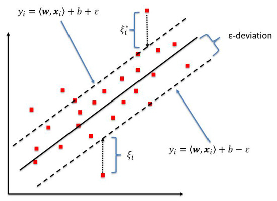 SVR [26] is an extension of the support vector machine (SVM) to regression problems, and it can make more complex predictions than the linear regression model. A one-dimensional example of SVR is shown in Figure 5, where the data points represent the predicted values and the line represents the truth/reference/label data. The two dashed lines are the bounds that are distance away from the reference data, where is a parameter chosen by the user. SVR uses only values outside the dashed lines to build the model. Training an SVR means solving: