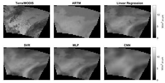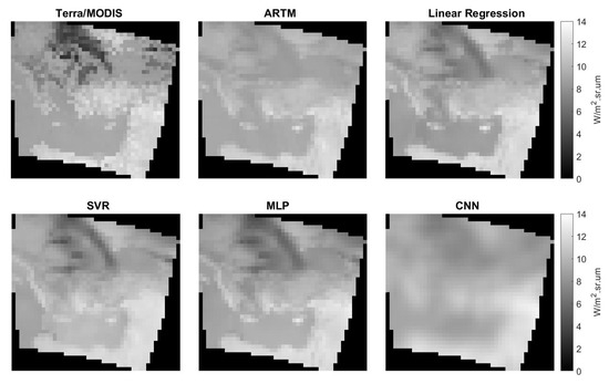 To visualize the results, Figure 8 displays predicted TOA thermal infrared data for one of the test images for the various models, with the Terra/MODIS down-sampled reference image displayed top left. Clouds (dark pixels) are clearly visible in the Terra/MODIS image, and slightly visible in the linear regression, SVR, and MLP models. However, the CNN produces estimated radiances that are more averaged over the scene, which can be explained by the use of spatial information around the pixel of interest to train the model. The ARTM model does not account for clouds well.