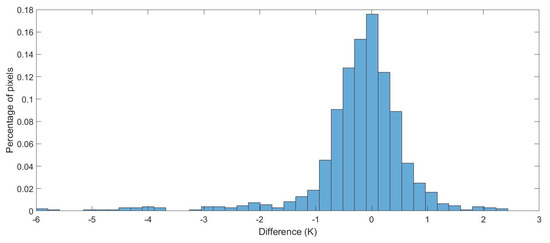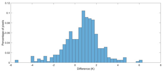MERRA-2 skin temperature over water was also evaluated. MODIS Sea Surface Temperature (MOD 28) was used as validation [34] (only pixels where the MODIS Quality Control (QC) flag was 0 (good) as recommended by the MODIS Sea Surface Temperature (SST) guide document [35]). Figure 11 displays the histogram of the differences between MODIS SST and MERRA-2 skin temperature. An RMSE of 1.05 K, standard deviation of 1.02 K, and a mean error of −0.25 K was found by evaluating 1080 grid points. As 1.05 K is approximately 0.1 W/m·sr·m in Terra/MODIS band 31, approximately 0.1 W/m·sr·m of the 0.62 W/m·sr·m, or 16% of the error over water in the ARTM model displayed in Table 1, can be attributed to the use of the MERRA-2 skin temperature.