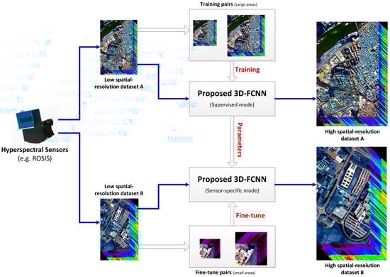 The rest of this paper is organized as follows: our proposed 3D-FCNN architecture for spatial SR of HSIs is proposed in Section 2. The experimental results on HSIs acquired by different sensors are reported in Section 3. Finally, discussions and conclusions are presented in Section 4 and Section 5, respectively.
