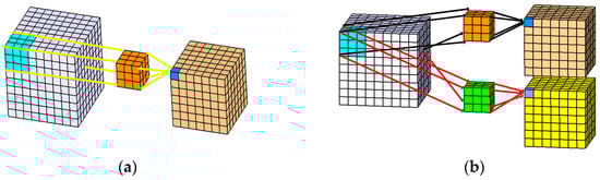 Though CNN has achieved great success in 2D convolution, the 2D convolution is only applied in the 2D space to capture spatial features. In 3D hyperspectral applications, the most straightforward method is to perform 2D CNN processing on each band of HSIs. However, such a 2D convolution on multiple images separately does not explore spectral information encoded in contiguous bands, easily resulting in spectral distortion. To this end, the spectral dimension should also be considered in the convolutional kernel to extract spectral features. Therefore, in this paper, 3D convolution instead of 2D convolution is used to simultaneously conduct convolution in both spatial and spectral dimensions to capture spatial-spectral features. As shown in Figure 3a, 3D convolution is realized by convolving a 3D kernel with the cube formed by stacking multiple contiguous spectral information together. By extending 2D convolution in Equation (1), 3D convolution is calculated as the weighted sum of pixels in a 3D data cube as