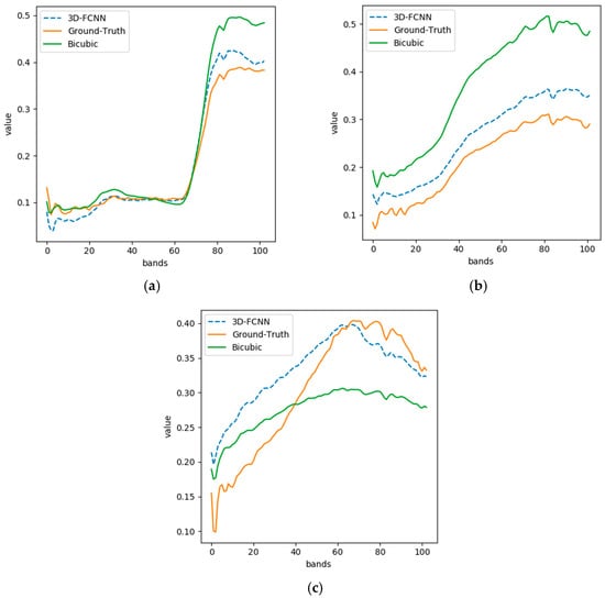 Five strategies are chosen as the baseline for comparison: Bicubic SR, Bilinear SR, SR by nearest neighbor, SRCNN [40,42] in a band-by-band manner (namely misSRCNN in [44]) and three-band-wise manner (denoted as 3B-SRCNN). The qualitative comparison results of all the considered algorithms are listed in Table 2. Their corresponding visual results are shown in Figure 5 and Figure 6, respectively. It is also observed that: (1) the proposed 3D-FCNN obviously outperforms all the other algorithms all over these two datasets by ROSIS sensor with the highest MPSNR and MSSIM values and lowest SAM for all the cases; (2) The proposed 3D-FCNN provides better results no matter how noisy the dataset is. The average improvements in MPSNR are 2.572 dB and 2.878 dB, and in MSSIM are 0.033 and 0.032 compared with Bicubic when dB and dB, respectively, indicating that the proposed 3D-FCNN is robust to noises in low spatial-resolution HSI; (3) The proposed 3D-FCNN based algorithm provides much better spectral fidelity (i.e., lower SAM) compared with SRCNN (msiSRCNN and 3B-SRCNN). Figure 7 further lists the spectra of several typical ground materials after spatial SR. It can be observed that the spectra reconstructed by the proposed 3D-FCNN is closer to their ground-truth than that by the bicubic spatial interpolation, demonstrating that the proposed 3D-FCNN can better maintain spectral characteristics during spatial SR. This is because both spatial context in neighboring areas and spectral correlation in full-band images are considered in the proposed method by 3D convolution; (4) The proposed 3D-FCNN based algorithm also achieves best spatial reconstruction for all the cases, which has the highest MPSNR and MSSIM values. Compared with the Bicubic algorithm, the average improvements are 2.849 dB in terms of MPSNR and 0.035 for MSSIM.