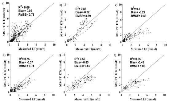 We should note that the accuracy of MS–PT algorithm depends on the errors for EC ET observations because we consider ET observations as true values in calculating the weights for the MS–PT algorithm. Although we correct ET by Twine et al. [] method, the inaccuracy in the measured data still exists, such as the energy imbalance issue, with H + LE < Rn − G (H: sensible heat flux; LE: latent heat flux) []. The mismatches in scale among different datasets may also lead to differences between the simulated and measured values. For example, the original spatial resolutions of meteorological reanalysis data and the NDVI3g data are 0.1 degree and 8 km, respectively. While the NDVI3g data was converted to a resolution of 0.1° × 0.1° using bilinear interpolation, the resample process may also result in biases. Additionally, EC observations represent a point-based value with merely hundreds of meters in diameter, which may also cause differences between ET observations and the true ET []. If the input data has a higher spatial resolution, the performance of MS–PT can be greatly improved.